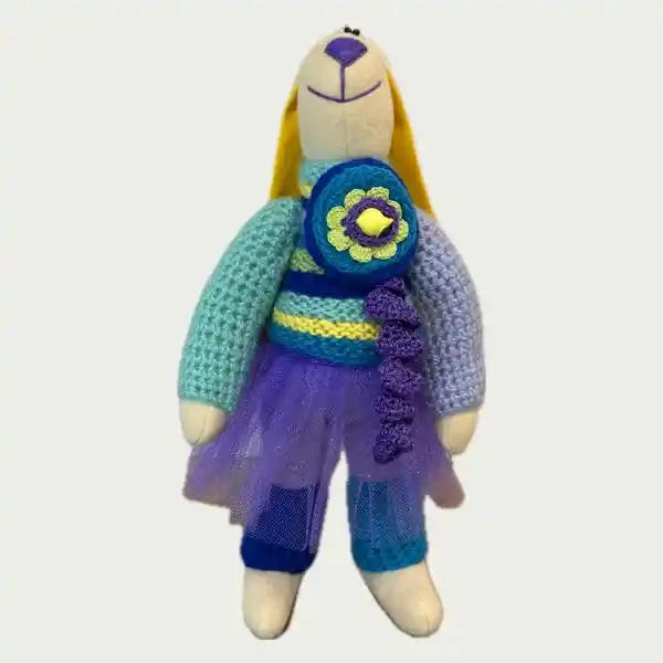 Авторские аксессуары: Шею зайки украшает вязаный цветок с лимончиком в центре и нарядной фиолетовой рюшей. Такой же, но меньшего размера, цветочек красуется и на её ушке, подчёркивая безупречный вкус.
